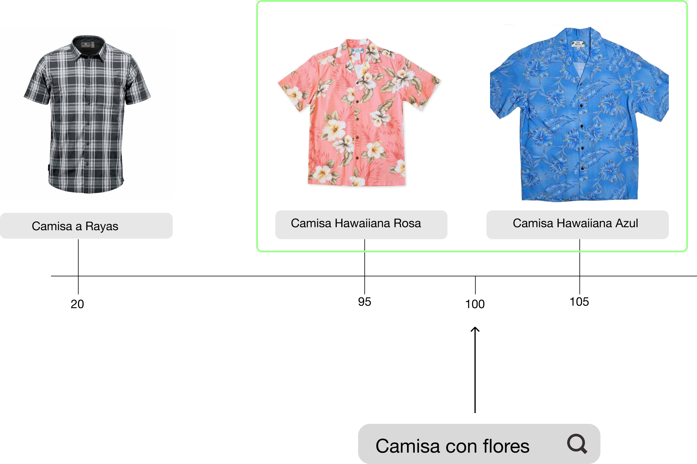 Ahora, las búsquedas que incluyan “clásica”, “rosa”, “flores”, “blanca”, “vacaciones” o “playa” encontrarán el artículo “Camisa Hawaiiana Rosa”.