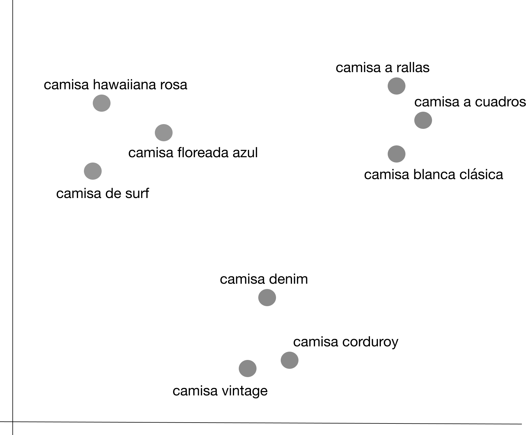 Ahora que podemos visualizar el catálogo en un gráfico bidimensional, podemos empezar a analizar patrones. Esto podría ser fundamental para enfocarse, por ejemplo, en los patrones de búsqueda de los usuarios y los puntos ciegos del catálogo.