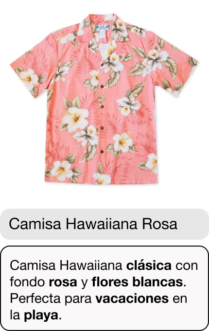Ahora, las búsquedas que incluyan “clásica”, “rosa”, “flores”, “blanca”, “vacaciones” o “playa” encontrarán el artículo “Camisa Hawaiiana Rosa”.
